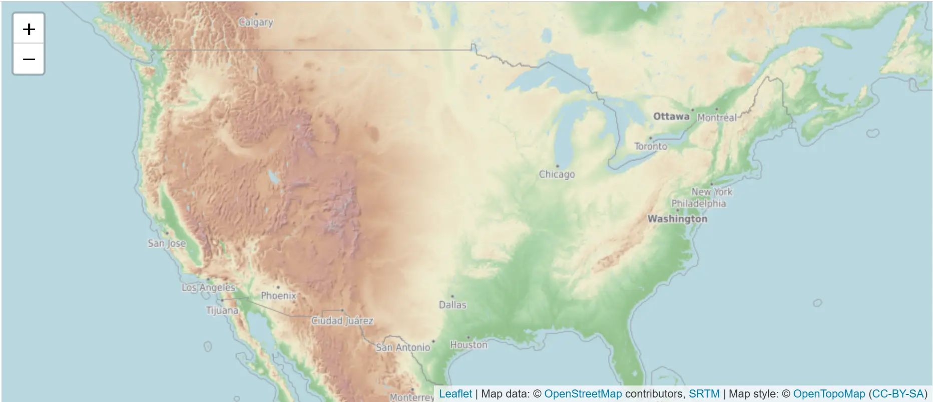 Here, the map is centered roughly in the central United States. When the app runs, a basic interactive map will appear in your browser. You can pan (drag) and zoom the map using your mouse.