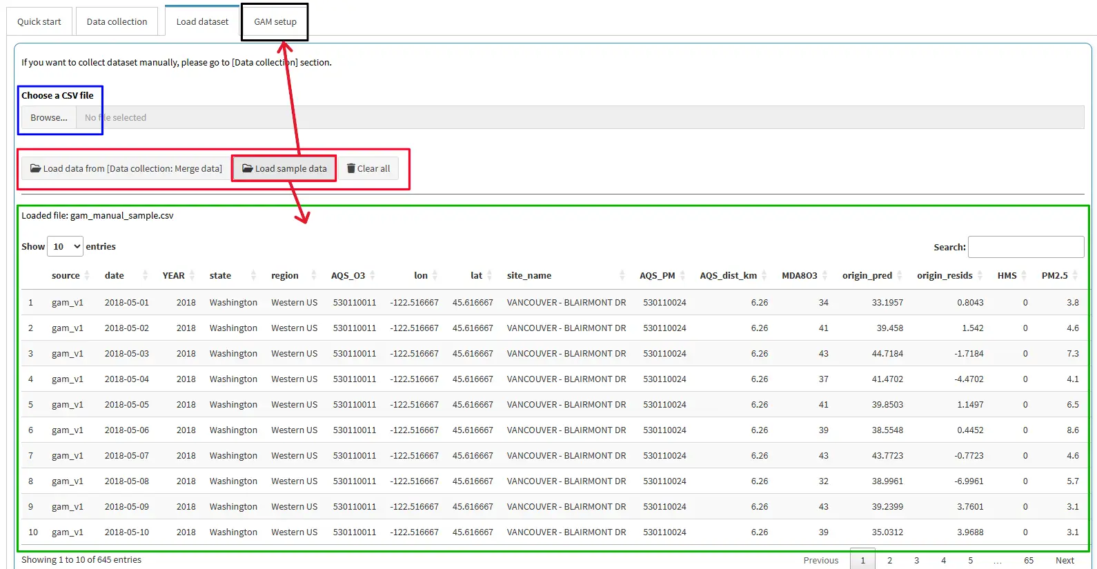 It includes two main sub-tabs: [Data collection], [Load dataset], [GAM setup], and [GAM results].