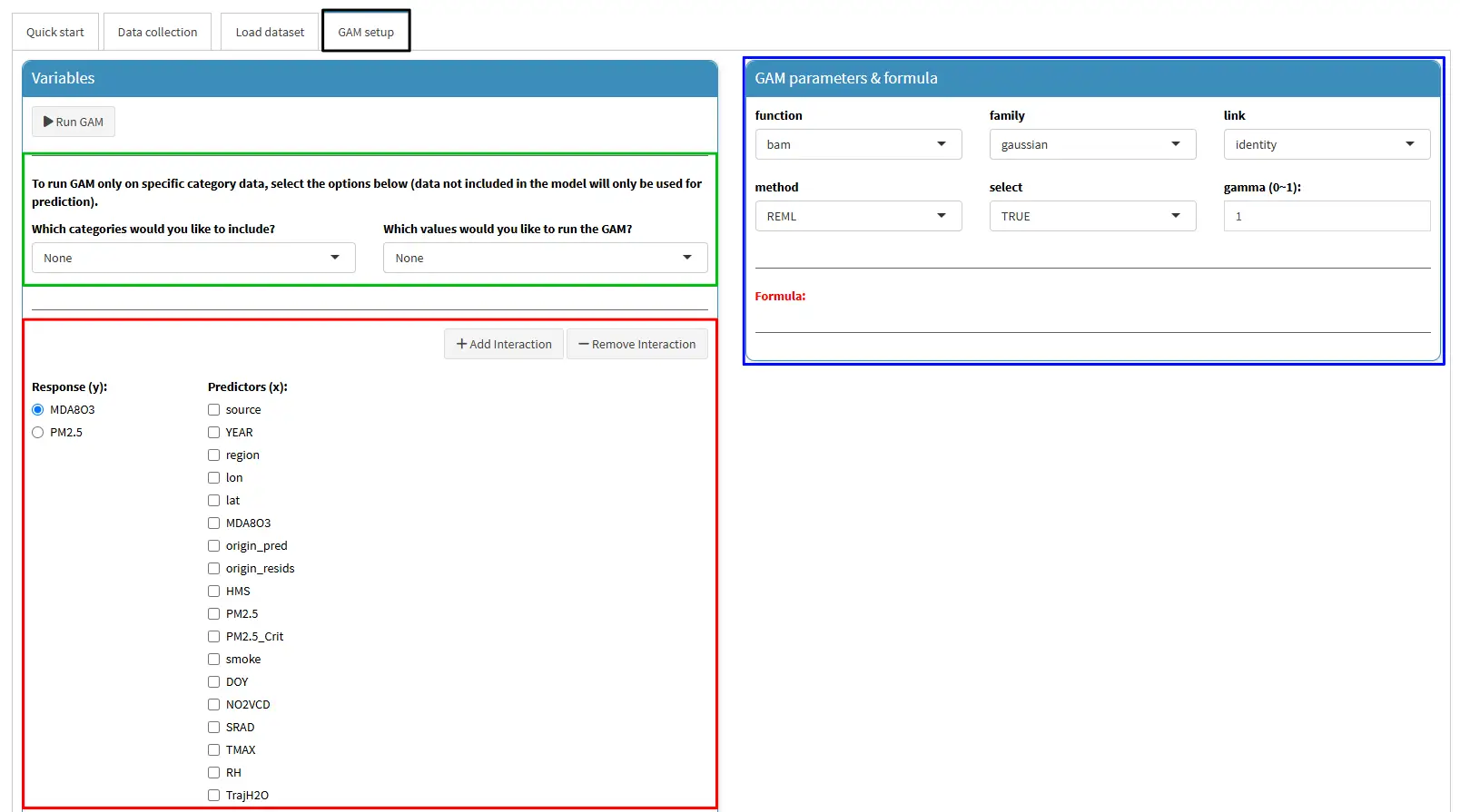 Variables: In this box, you can set up the response variable (y) and predictors (x) for GAM (red rectangle). Additionally, if you want to train the GAM for a specific category, you can configure this option as shown in the green rectangle.GAM parameter & formula(blue rectangle): This box displays the GAM setup status based on your selections, and allows you to control the GAM options and hyper-parameters such asfamily,link,method, etc. For more details, refer to themgcvpackage (Wood, 2023).