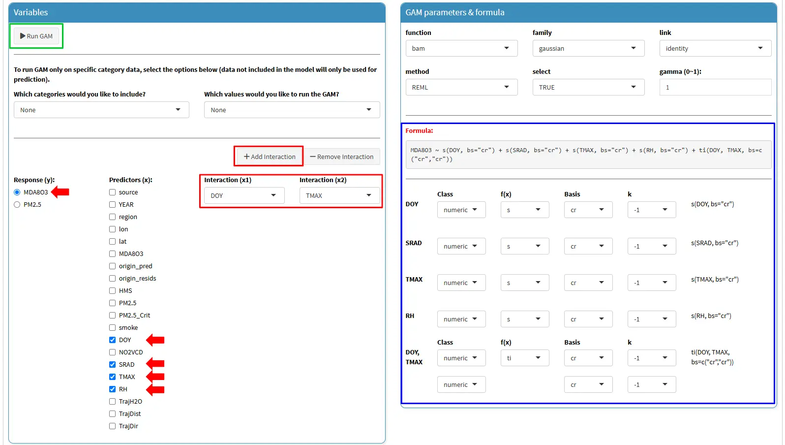 Add interaction, then set the variables asDOY(x1) andTAMX(x2) (red rectangle).