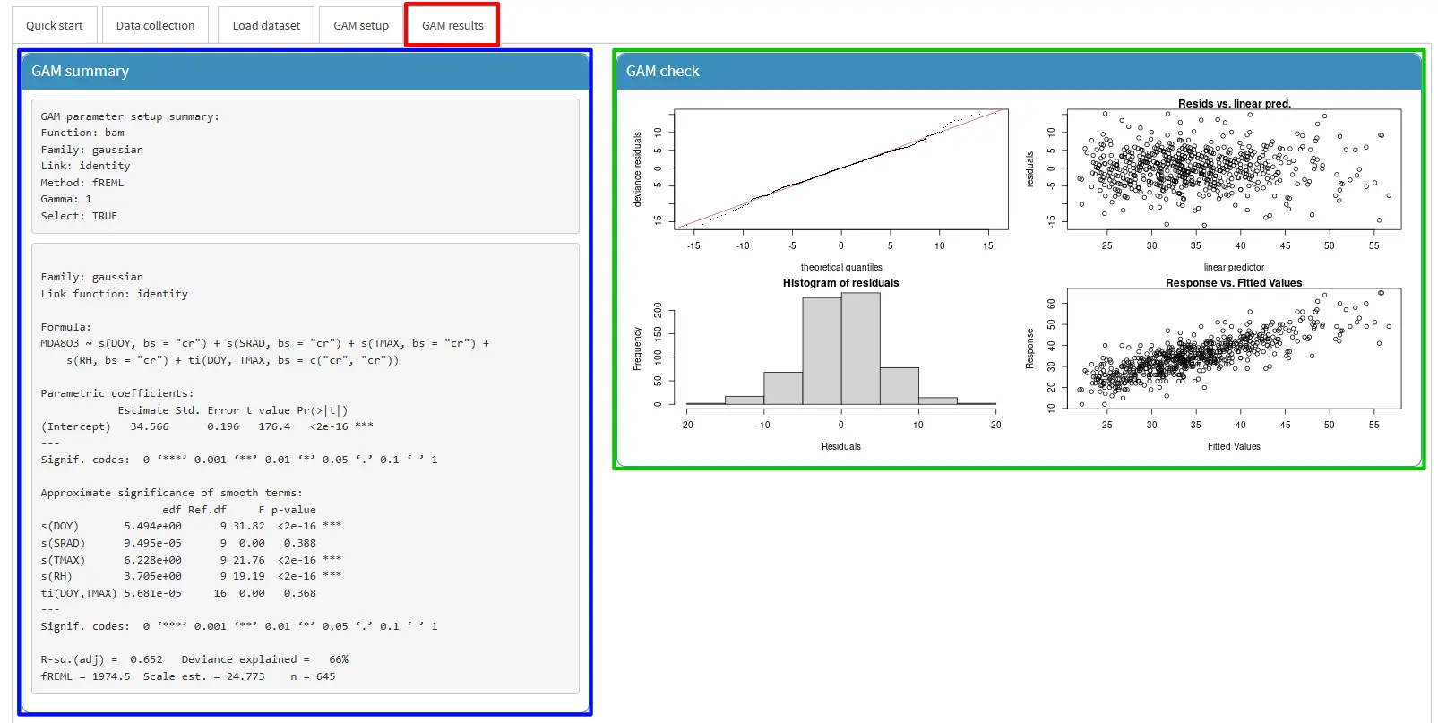 GAM summary(blue rectangle): Displays a summary of the fitted GAM model, including coefficients, significance, and model statistics.GAM check(green rectangle): Provides diagnostic plots to assess the model’s assumptions and fit quality.GAM smooth plots(black rectangle): Visualizes the smooth functions estimated for each predictor in the model.Data table: Shows the finalized data used for model training and predictions including predicted values, residuals, etc. If you want to download the data, you just click theSave databutton in the data table box.